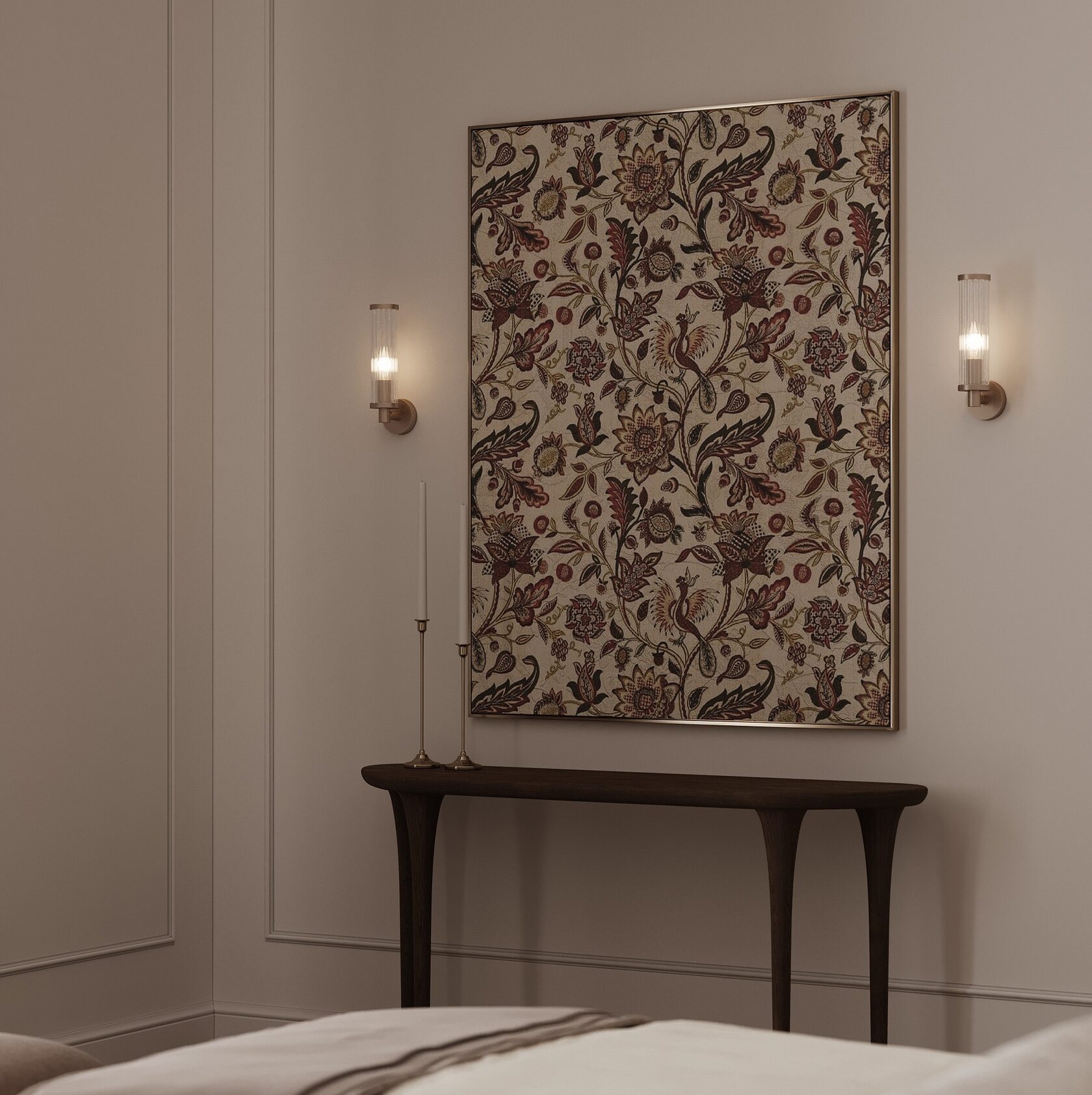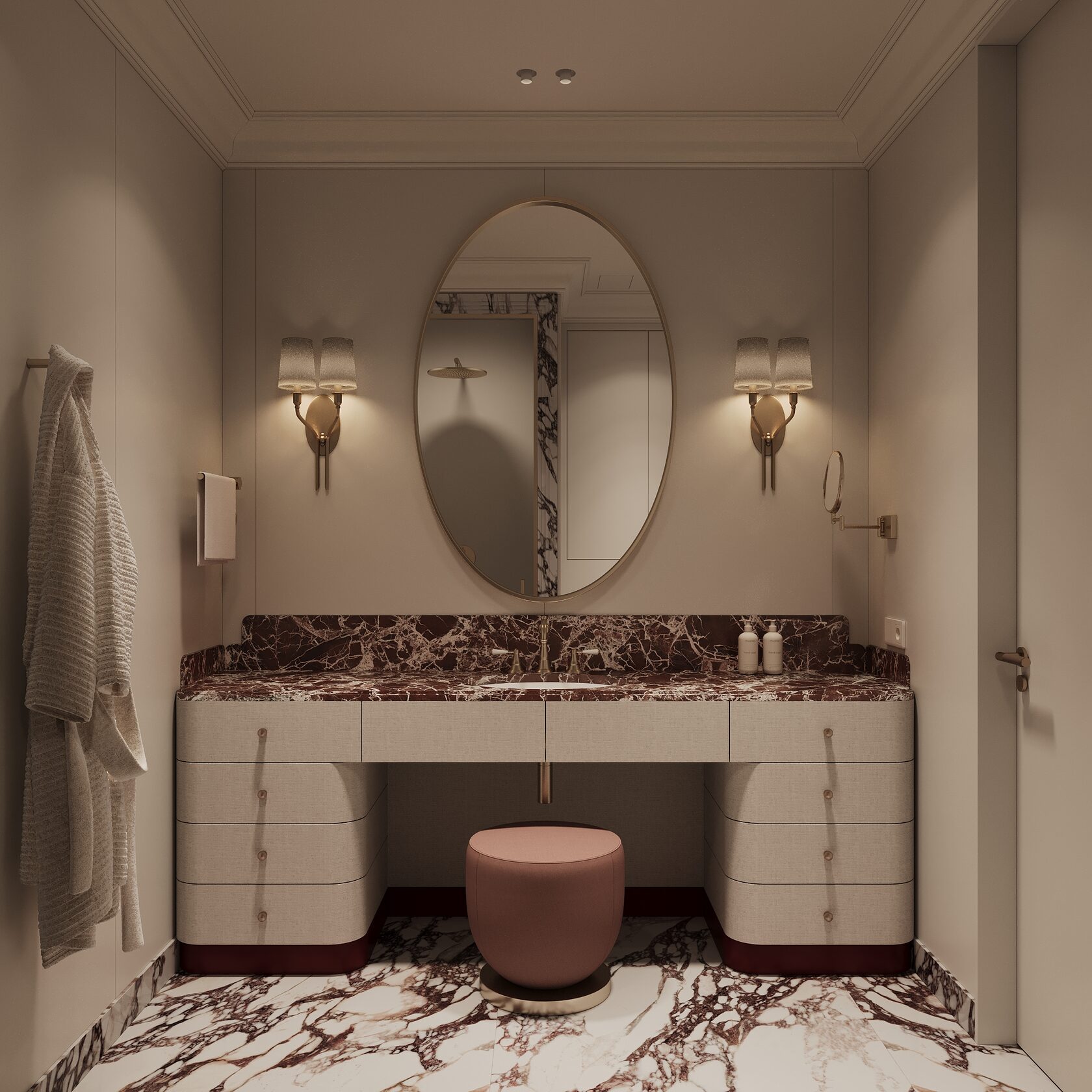 Взаимодействие света и отражающих поверхностей создаёт ощущение пространства, которое дышит. Хрустальные элементы, зеркала, стекло — всё поддерживает атмосферу лёгкости, не перегружая её. Особая роль отведена обоям ручной работы: они становятся эмоциональным ядром, живым акцентом, который добавляет интерьеру глубину и индивидуальность. Это не просто декор, а художественный штрих, задающий настроение всего пространства.